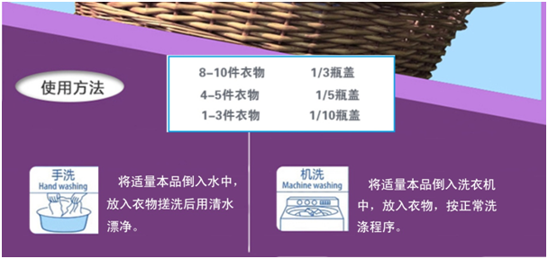 l 适用于麻、毛、棉、绒、化纤、混纺等面料的内、外各类衣物洗涤除菌。